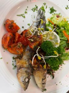 gebraten in Olivenöl mit Kirschtomaten, roten Zwiebeln, Knoblauch und feinen Kräutern dazu Weissbrot